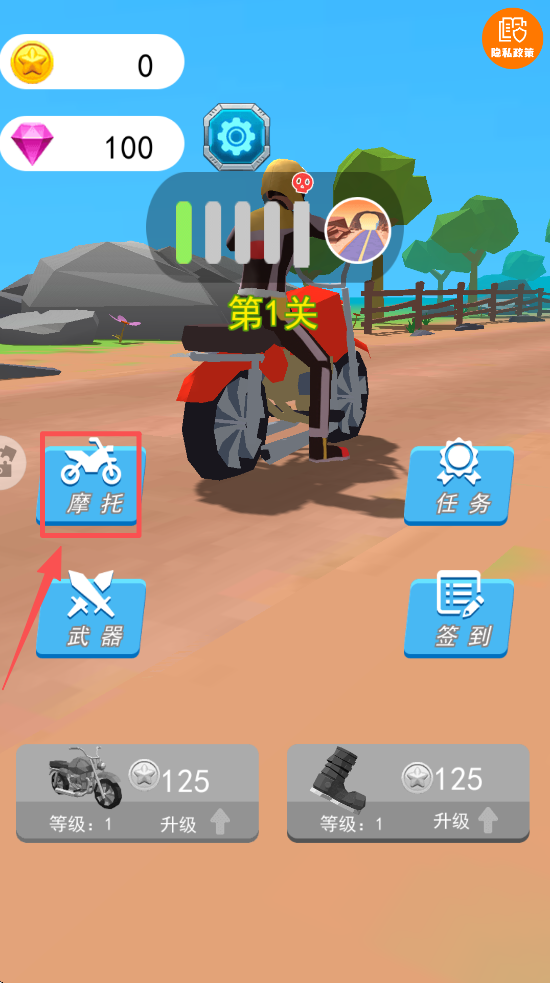 2、在主界面选择“摩托”或“武器”选项,准备开始游戏,挑战不同关卡。
