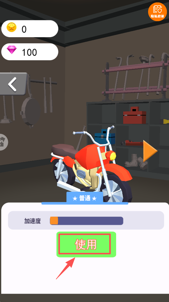 3、在车库中调整摩托车性能,点击“使用”按钮,装备或升级你的摩托车。