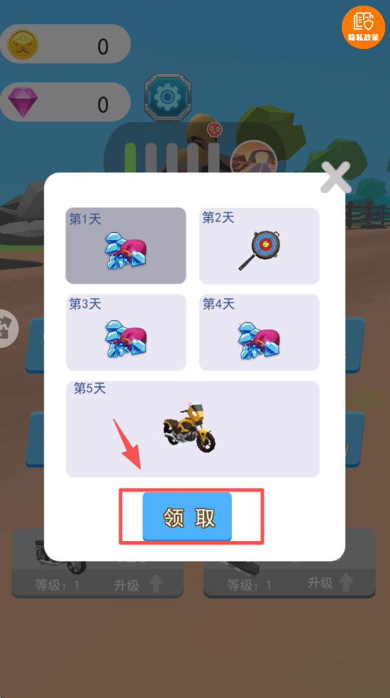 1、点击“领取”按钮,获取每日登录奖励,包括摩托车和游戏内道具。