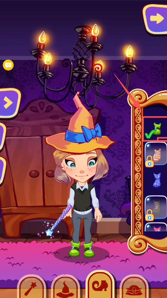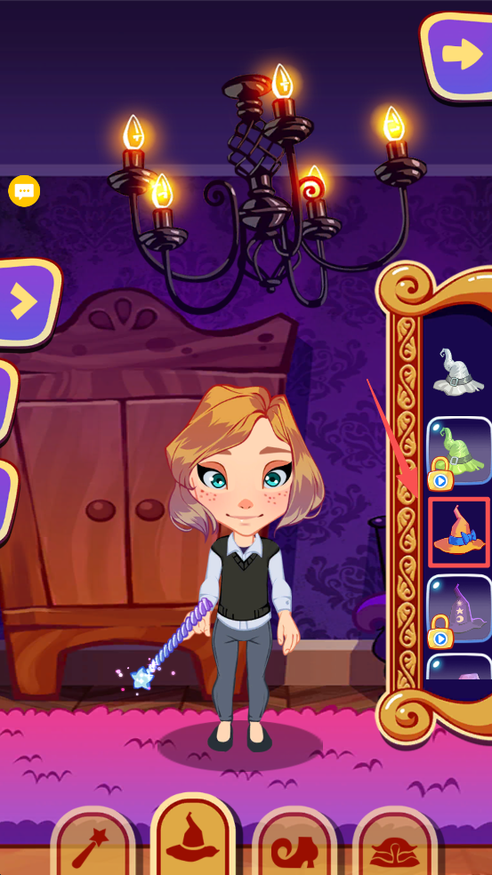 2、选择一件装扮物品,如巫师帽,点击它以装备到角色身上,改变角色外观。