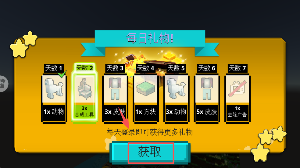 3、在每日礼物界面,点击“获取”按钮领取每日奖励,积累资源,为游戏助力。