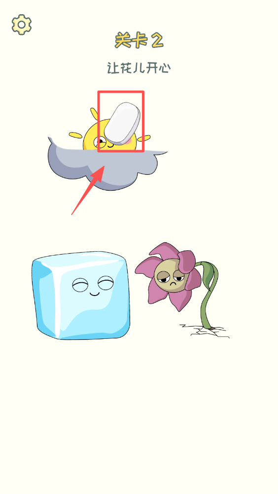 3、在关卡2中,用橡皮擦擦掉乌云,让太阳照在冰块上反射光线,使花朵开心。