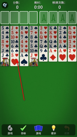 4、在牌上双击左键可以将牌自动飞上左上角,在左上角暂停区(周转区)牌上点右键可以将牌自动放到合适的列尾。