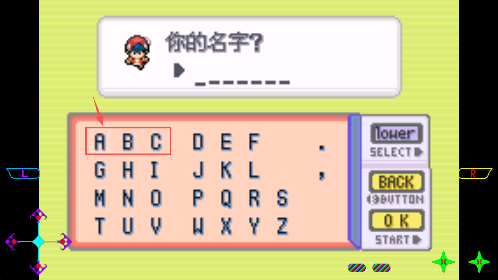 3、在字母选择界面,输入你的游戏角色名字。