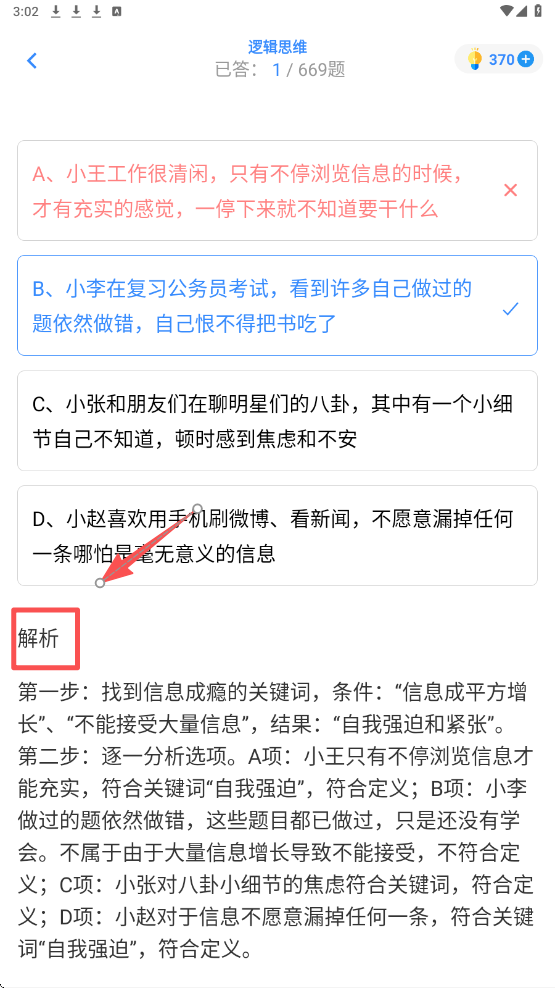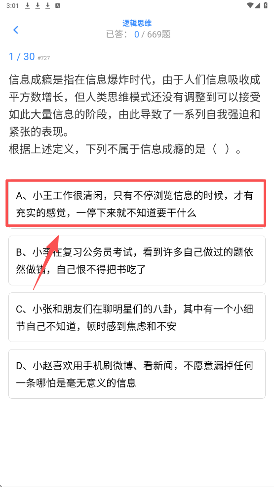 2、在逻辑思维题目界面,阅读题目后,选择你认为正确的答案。