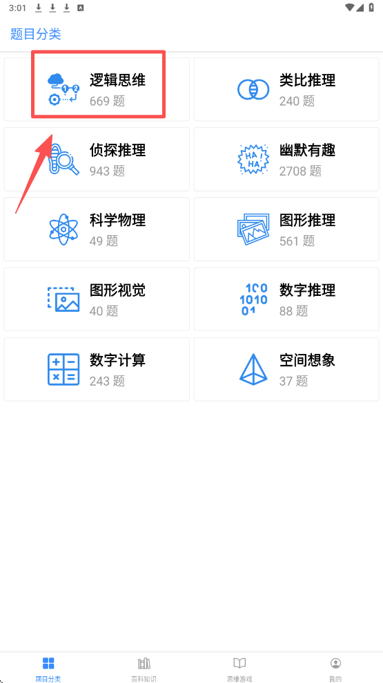 1、在题目分类界面,点击“逻辑思维”或其他分类,选择你想练习的题目类型。