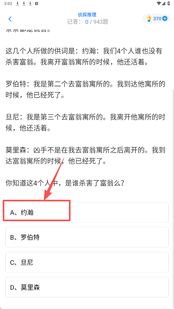 4、在侦探推理题目界面,根据线索推理出正确答案,锻炼你的侦探思维。