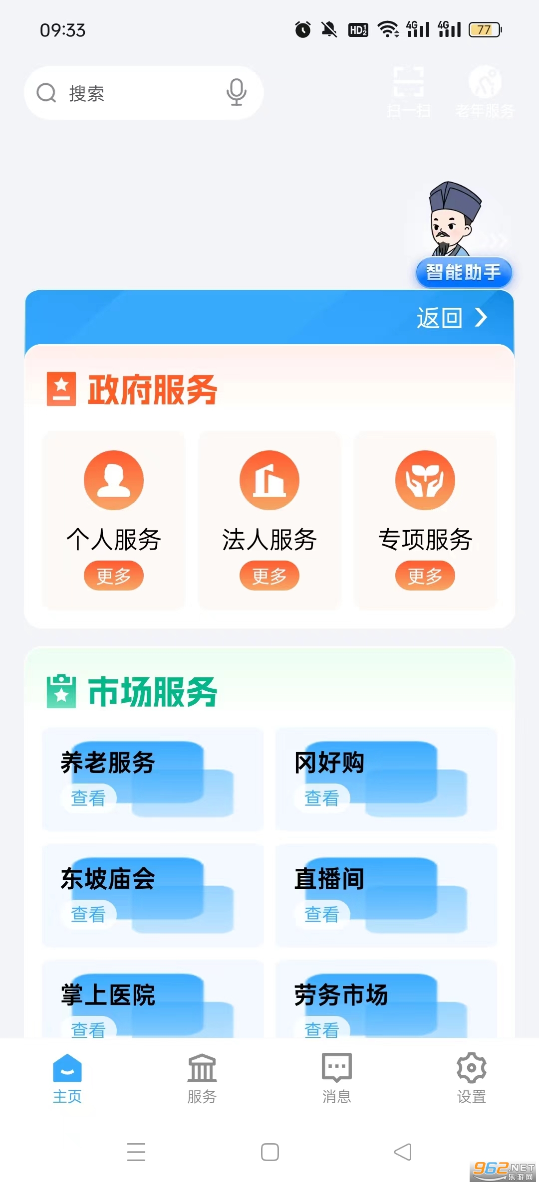 “市场服务”包含养老服务、冈好购、东坡庙会、直播间、掌上医院、劳务市场、学生服务、城乡供应链、邻里服务9个模块。