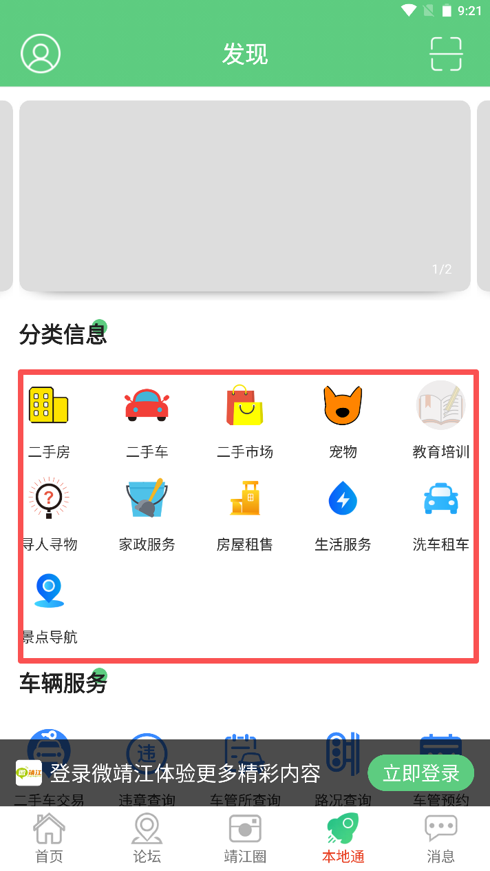 3、点击底部导航栏的“靖江圈”图标,查看和参与本地社区活动。