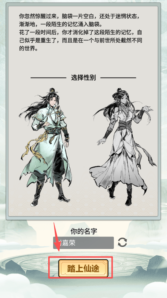 2、接着,选择角色性别,并为角色命名,点击“踏上仙途”以创建角色。