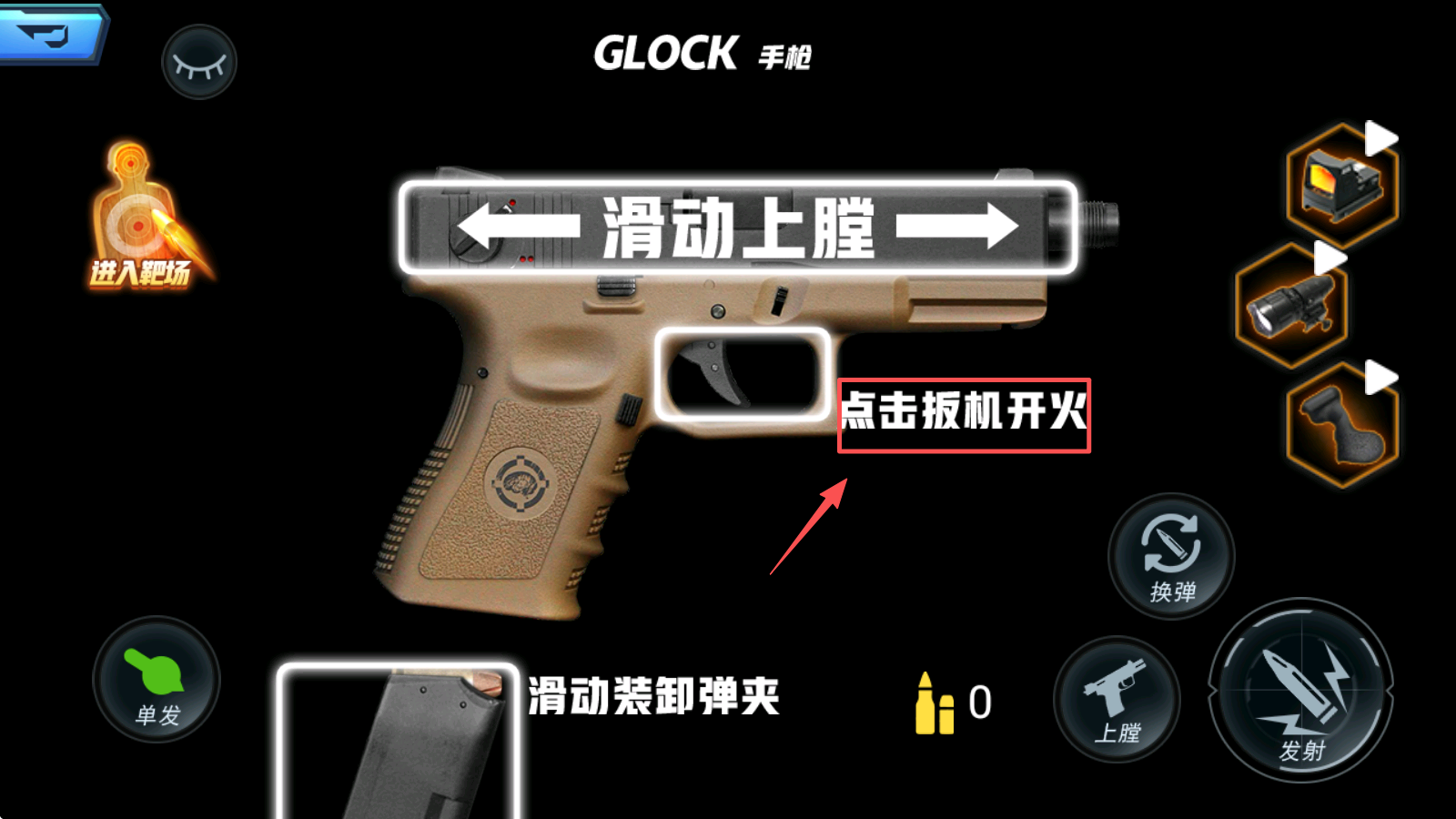 4、滑动上膛并点击扳机进行射击。熟悉枪械的操作方式是提高射击效率的关键。
