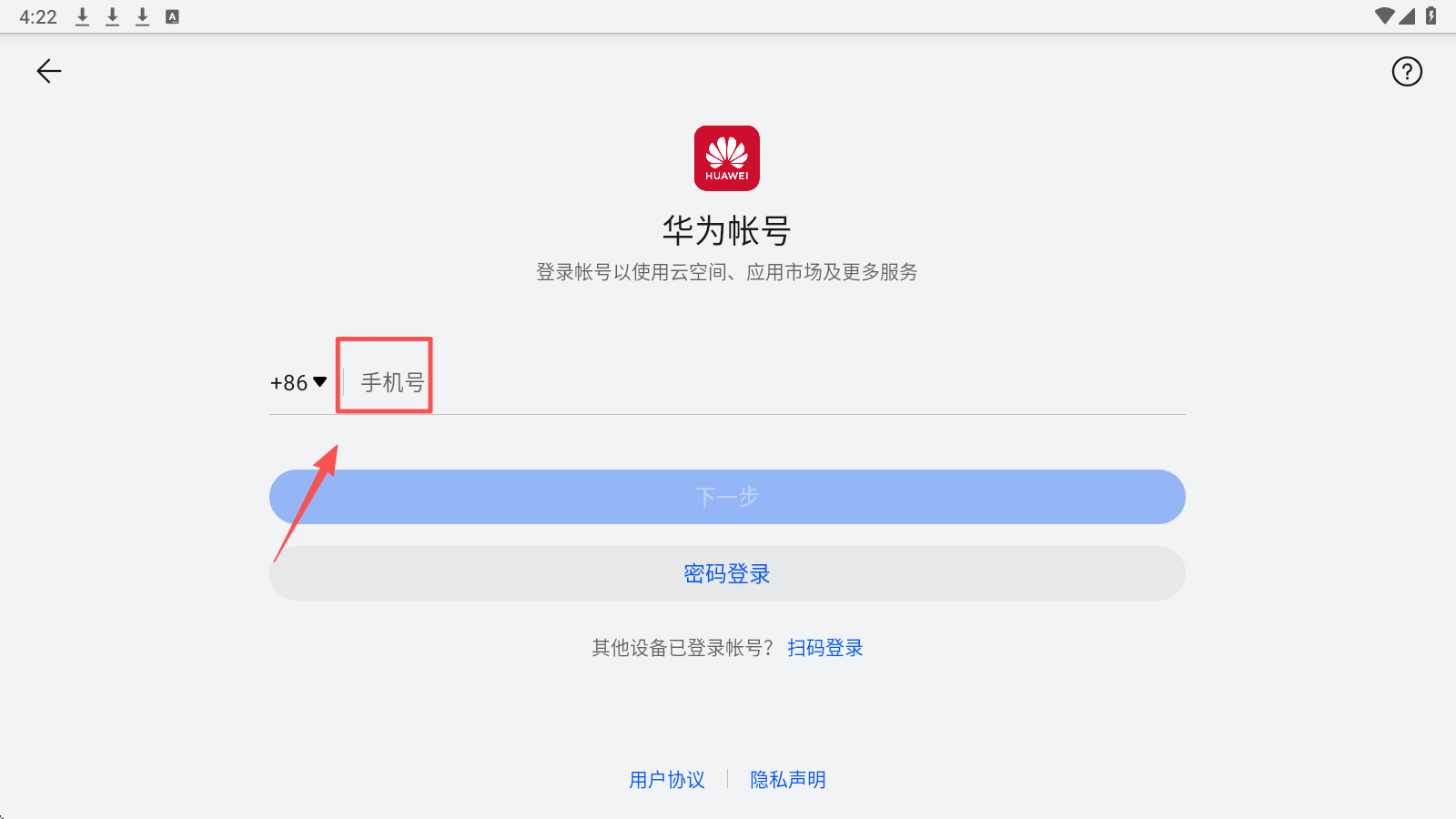 1、输入手机号,点击“下一步”,完成华为账号登录。