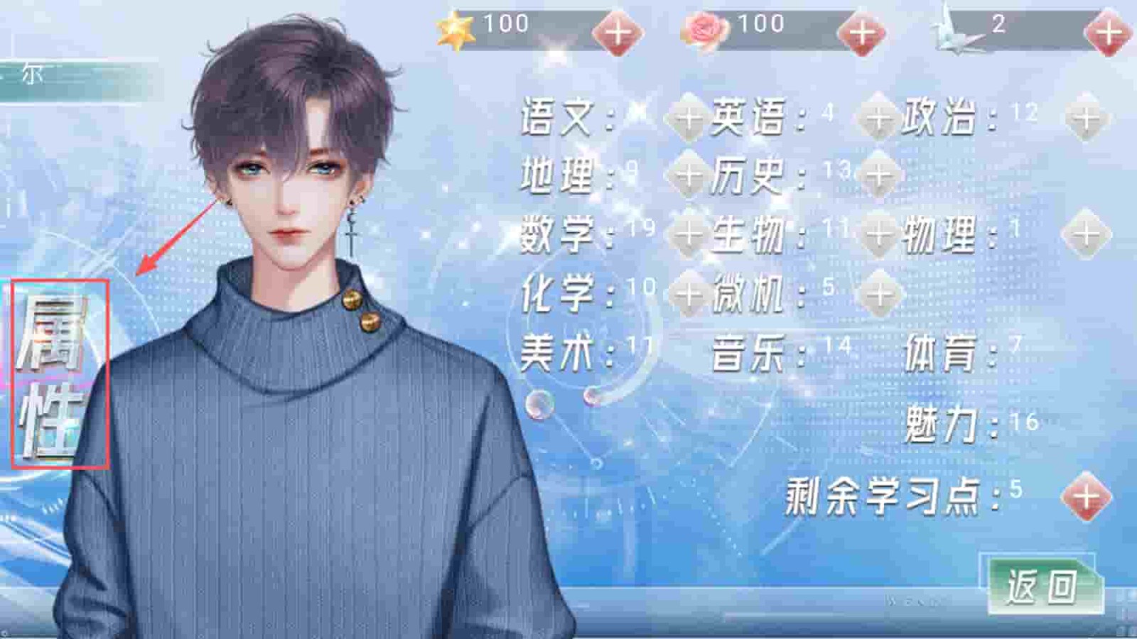 2、点击“属性”查看角色的学科成绩和魅力值,了解角色能力。