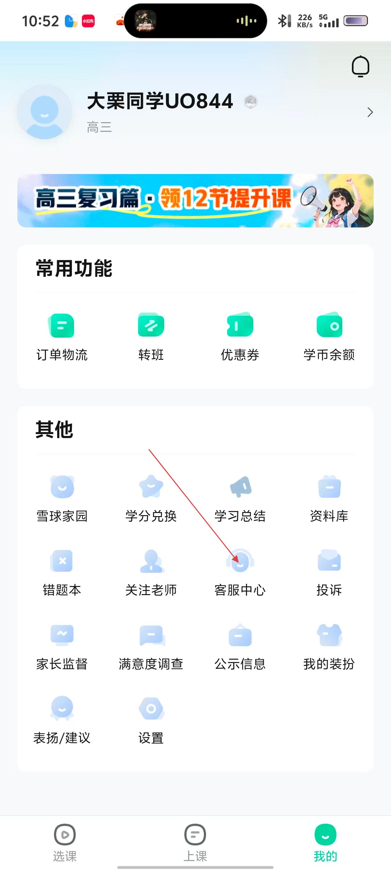 2、在个人页面中,找到【客服中心】选项并点击,进入在线服务页面寻求帮助。