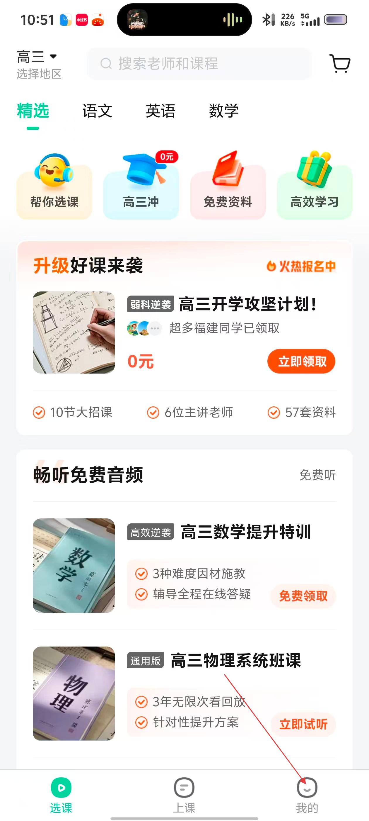 1、进入软件选课页面,可浏览各类课程推荐,若需查看个人相关,点击右下角【我的】按钮。