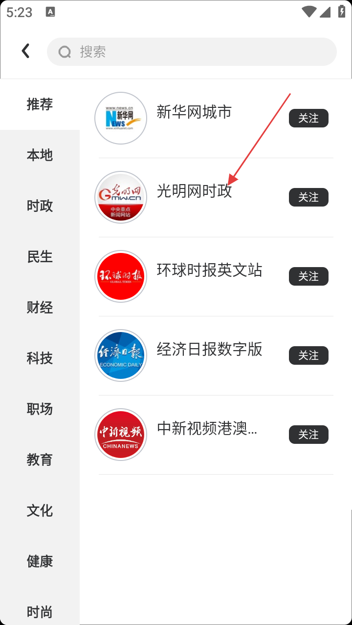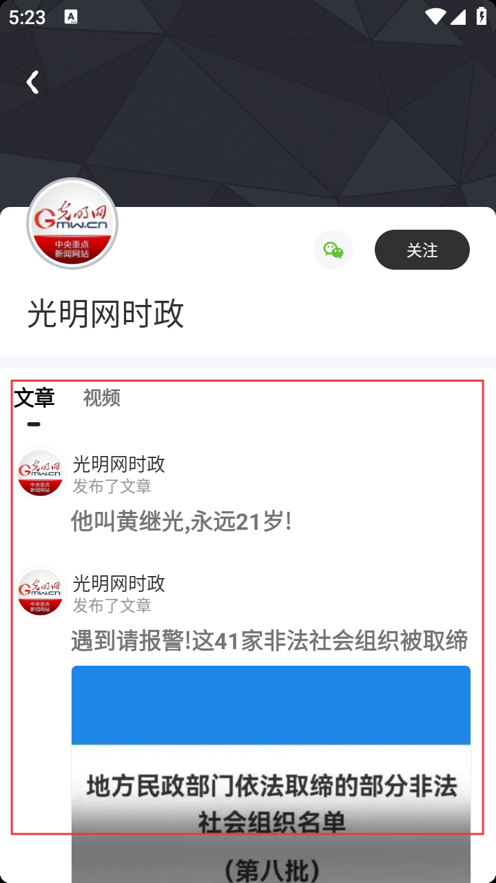 4、点击感兴趣的媒体账号,如“光明网时政”,进入该账号页面,可查看其发布的文章和视频等内容。