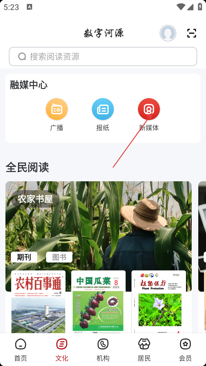 2、在文化页面,找到【融媒中心】板块下的【新媒体】选项,点击进入新媒体页面。