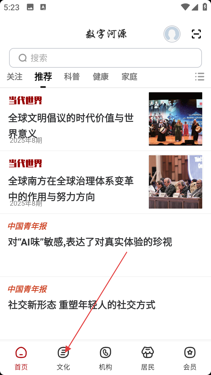 1、打开“数字河源”APP,进入首页后,点击底部导航栏的【文化】选项,进入文化页面。