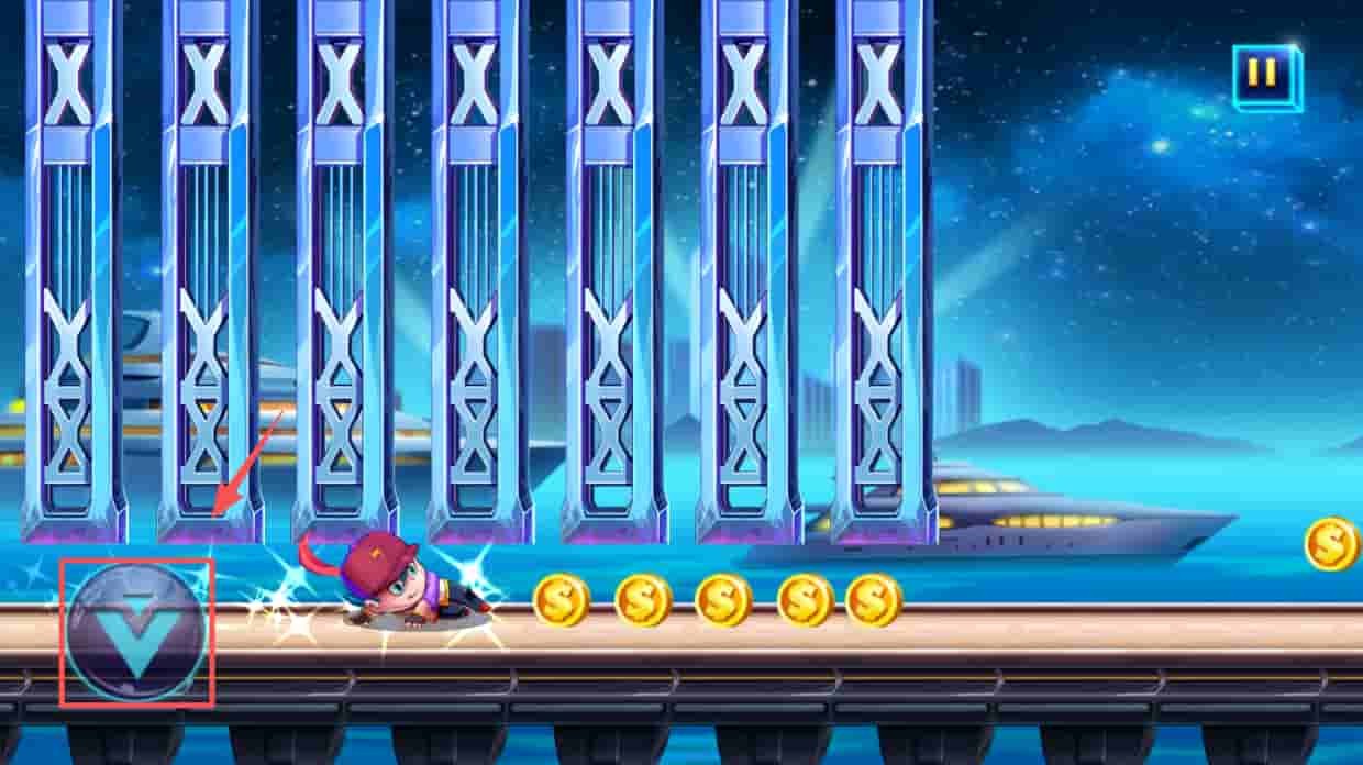 4、点击左下角的跳跃按钮,控制角色跳跃,收集金币,避开障碍。