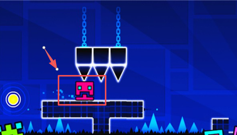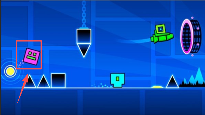 4、操控粉色角色跳跃移动,避开尖刺,向右侧的传送圈方向前进。