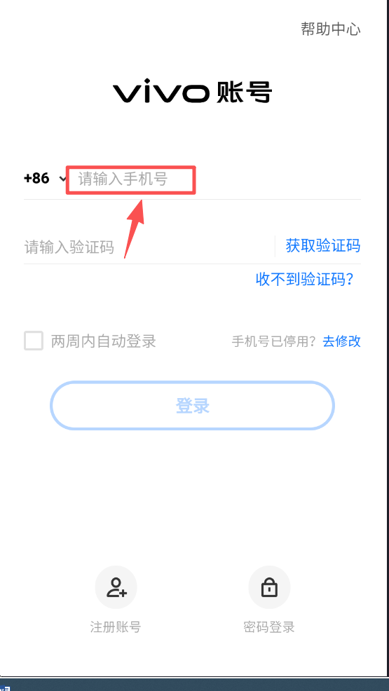 1、在 vivo 账号登录页,点击 “请输入手机号” 框,准备填写账号信息。