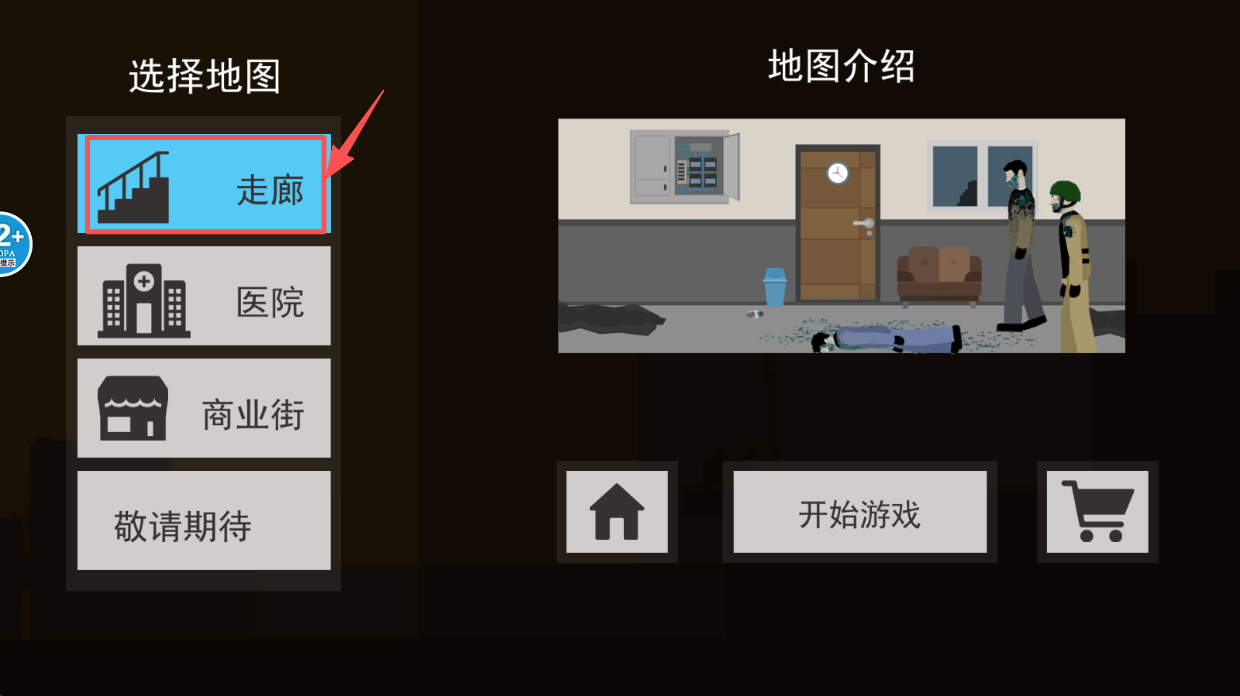 2、选择地图,在地图选择界面,点击“走廊”或其他地图开始。