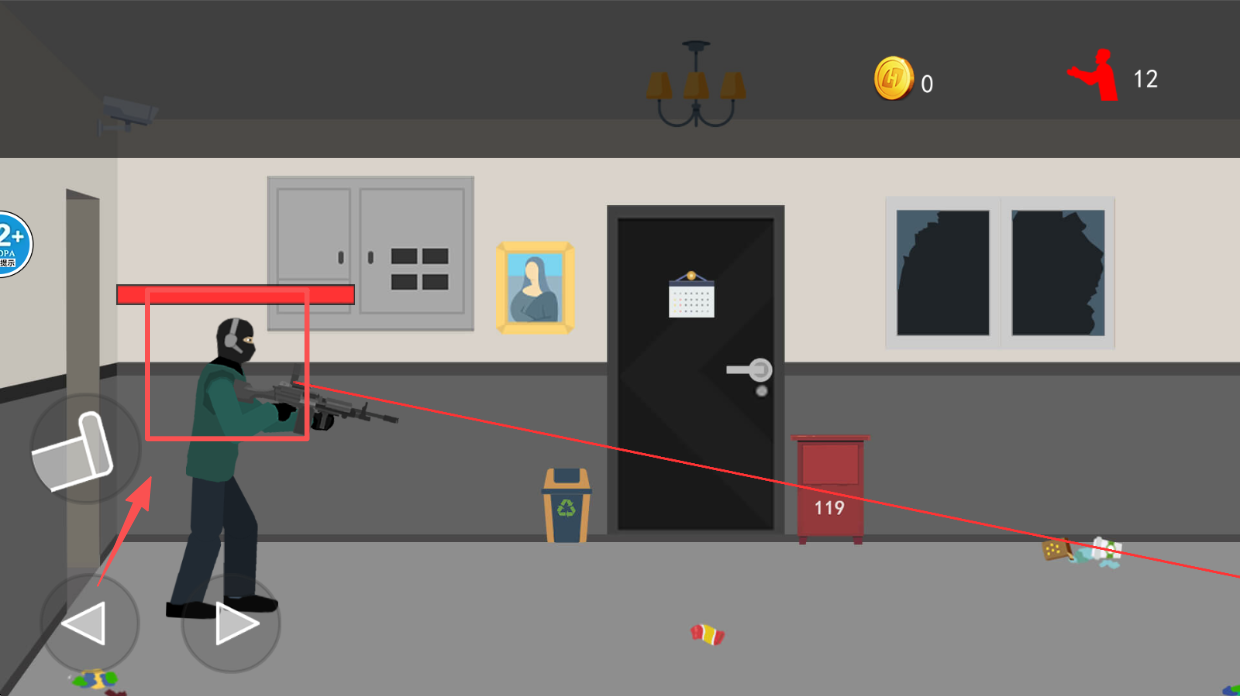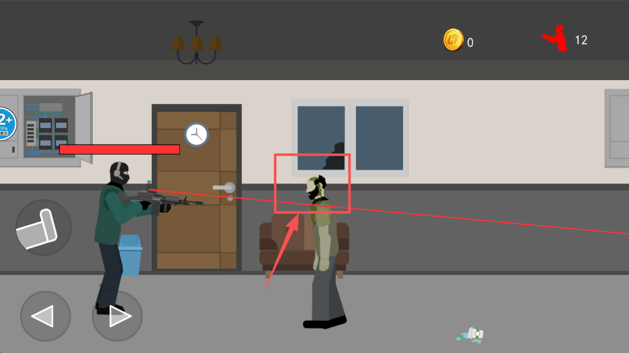 3、控制角色,使用屏幕上的虚拟摇杆和按钮控制角色移动和射击。