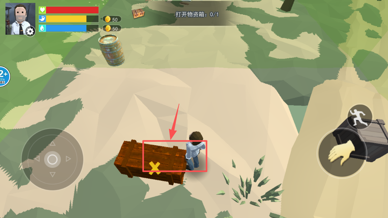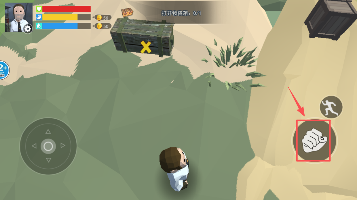 2、采集资源,接近物资箱,点击右侧“手”图标采集资源。