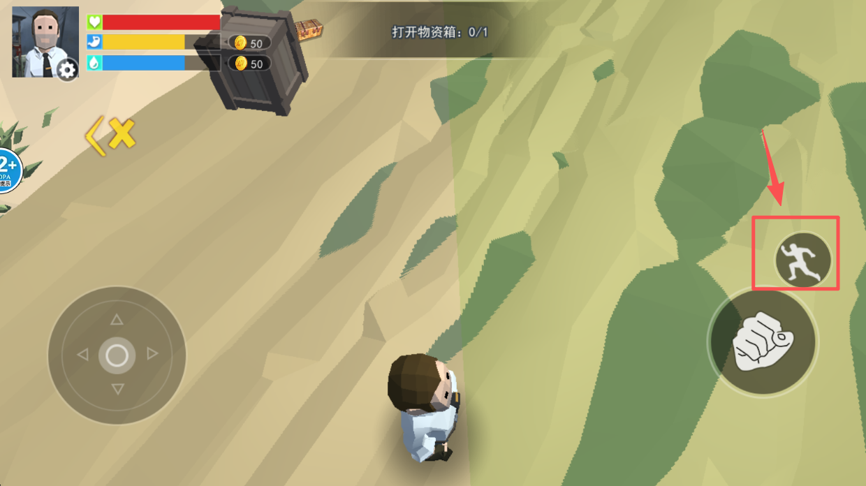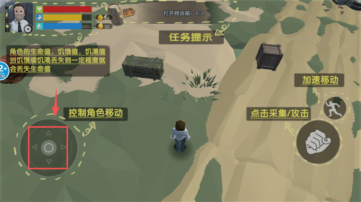 1、控制移动,使用左下角虚拟摇杆控制角色移动,探索环境。