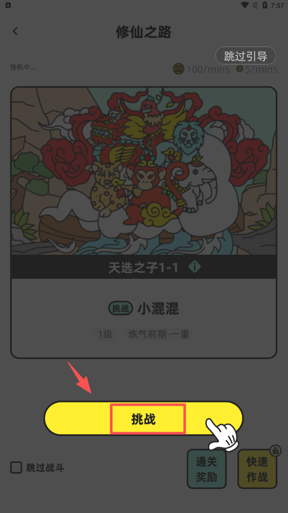 3、在修仙之路界面,点击“挑战”按钮,开始与小混混的战斗。