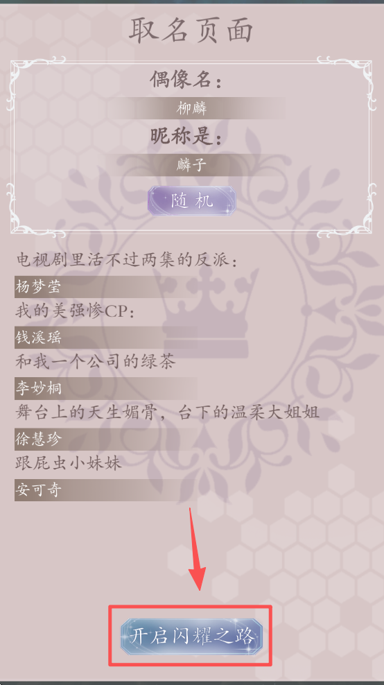 1、输入偶像名和昵称,点击“随机”按钮或直接点击“开启闪耀之路”进入下一步。