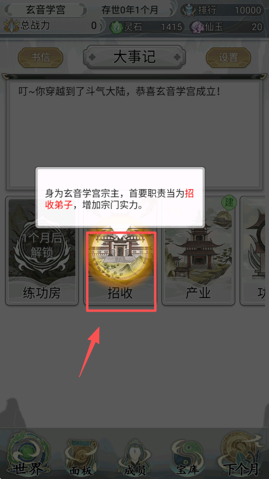 2、在大事记中,了解作为宗主的首要职责,即招收弟子以增强宗门实力。
