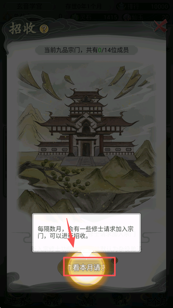 3、点击“招收”按钮,查看并招收新弟子,以扩大宗门规模和实力。