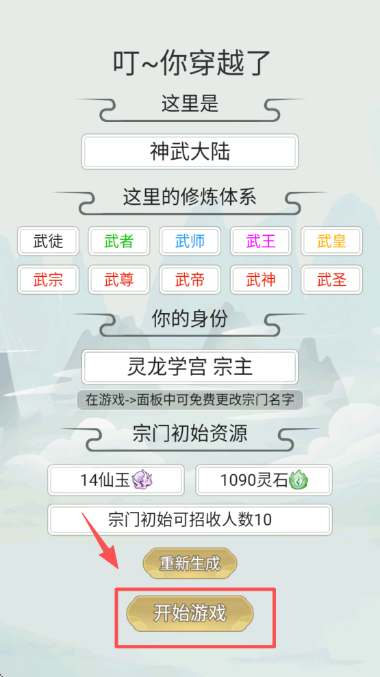 1、点击“开始游戏”按钮,进入游戏,选择你的宗门和修炼体系。