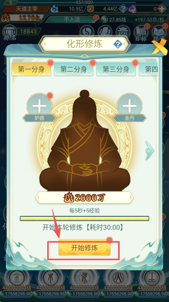 4、开始修炼。点击“开始修炼”按钮,消耗资源进行修炼,获取经验。