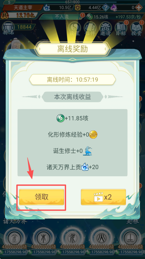 1、领取离线奖励。点击“领取”按钮,获取离线时间累积的奖励资源。