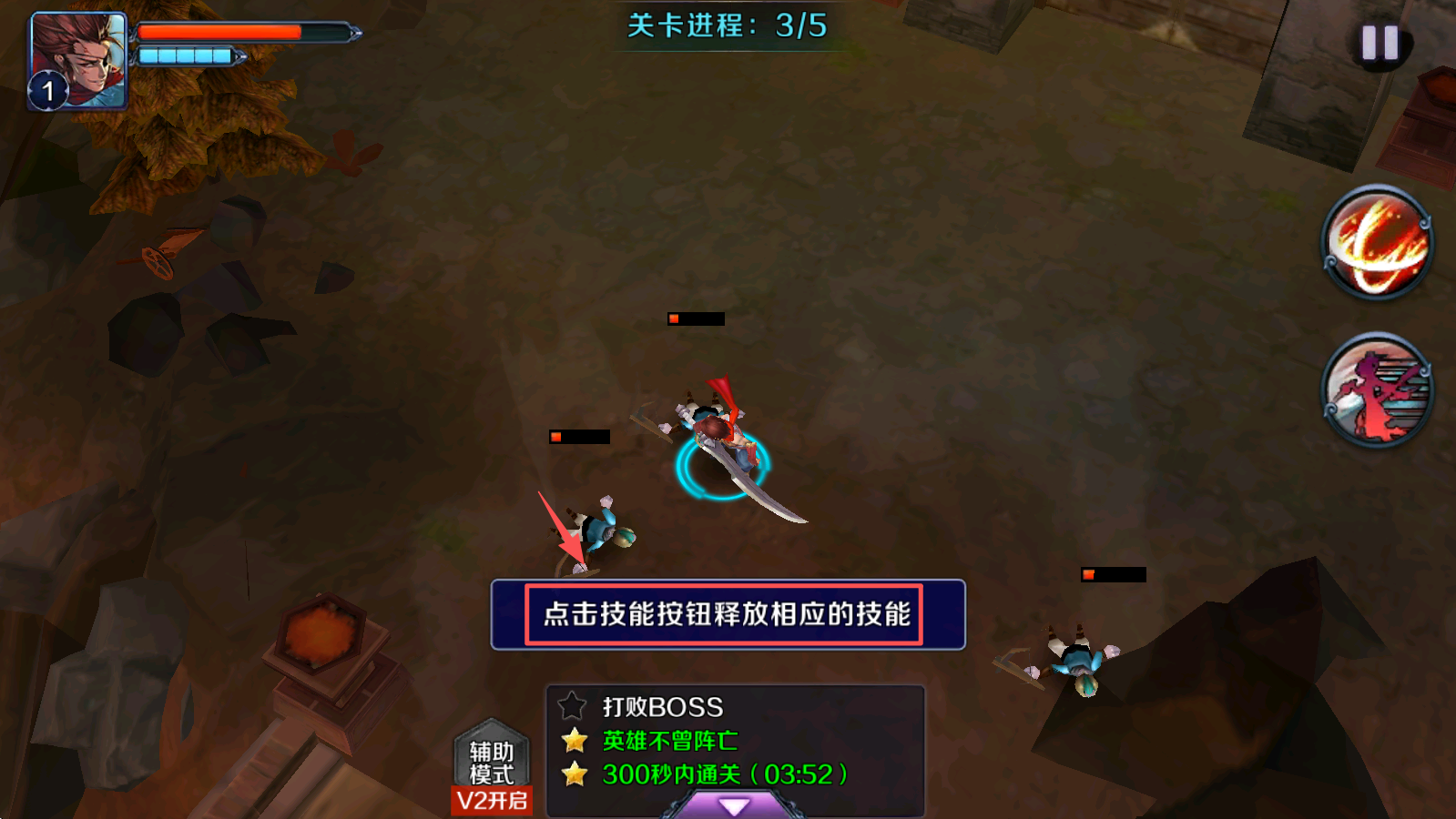 2、点击技能按钮释放相应的技能,增强战斗效果,击败敌人。