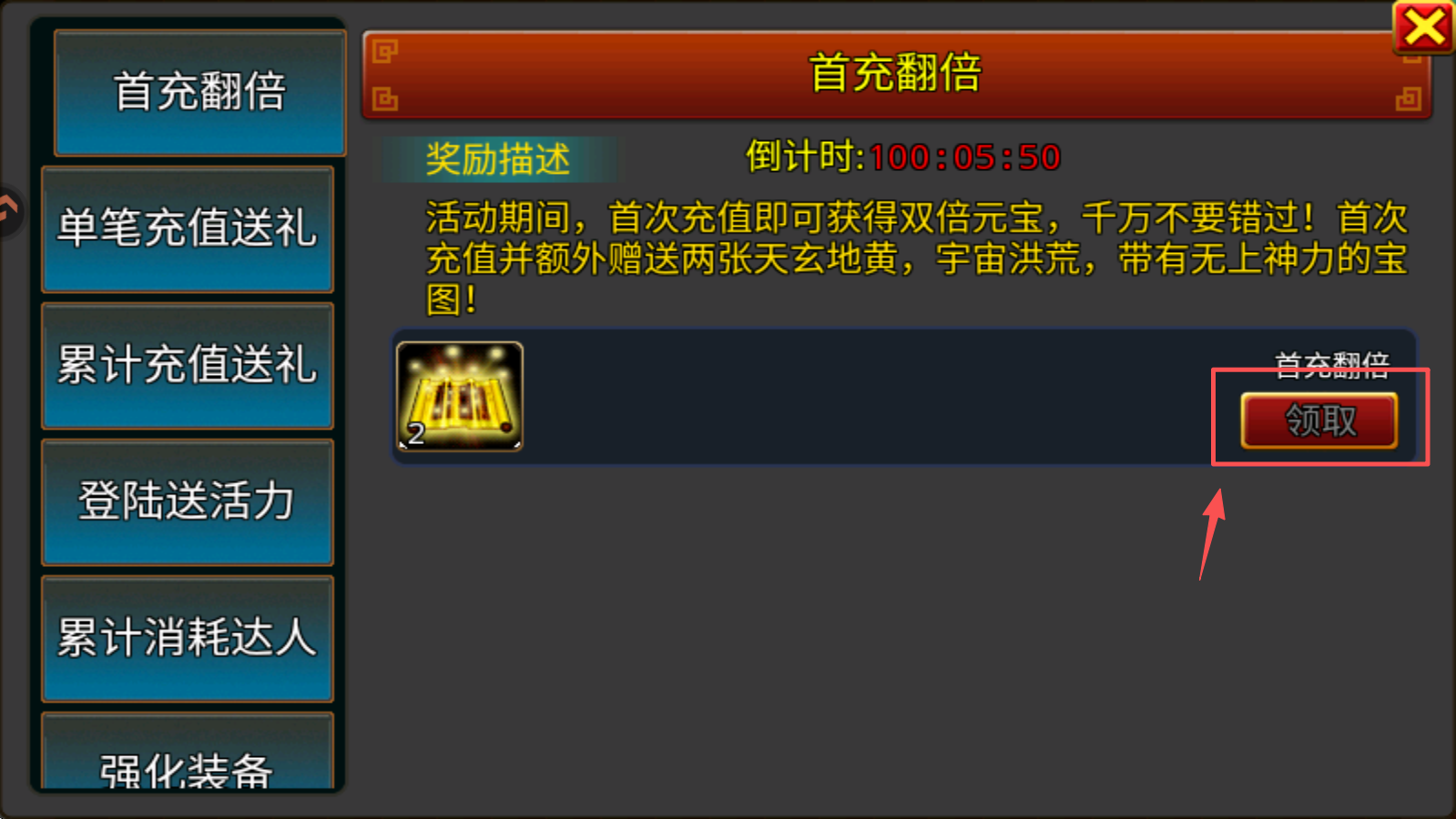 3、领取奖励,在活动界面,点击“领取”按钮,获取首充翻倍奖励,增加资源。