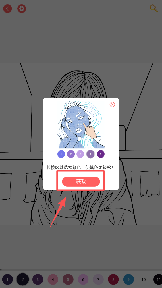 3、长按区域选择颜色,点击“获取”按钮,使填色过程更轻松。