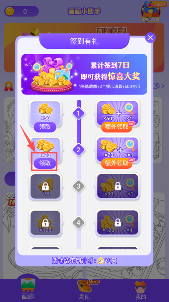 1、点击“领取”按钮,获取每日签到奖励,连续签到有惊喜。