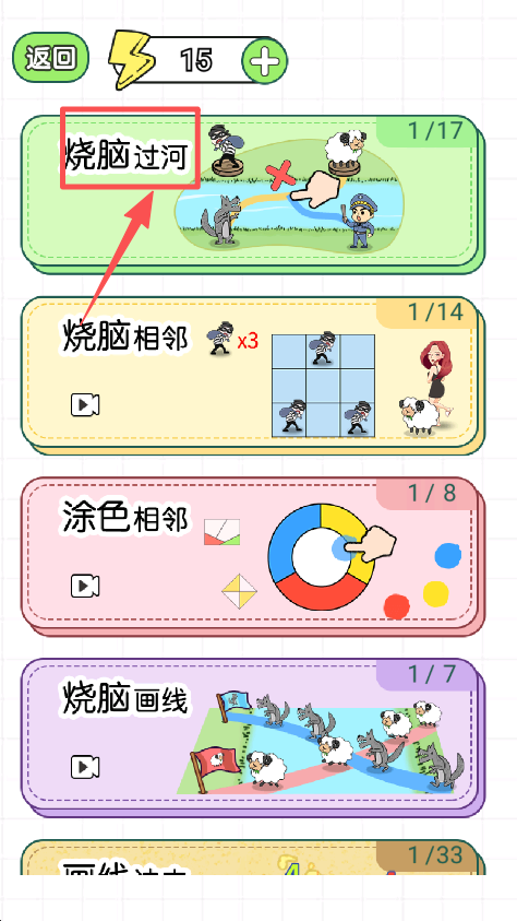 2、在关卡列表中,点击 “烧脑过河” 关卡选项,进入该关卡的游戏环节。