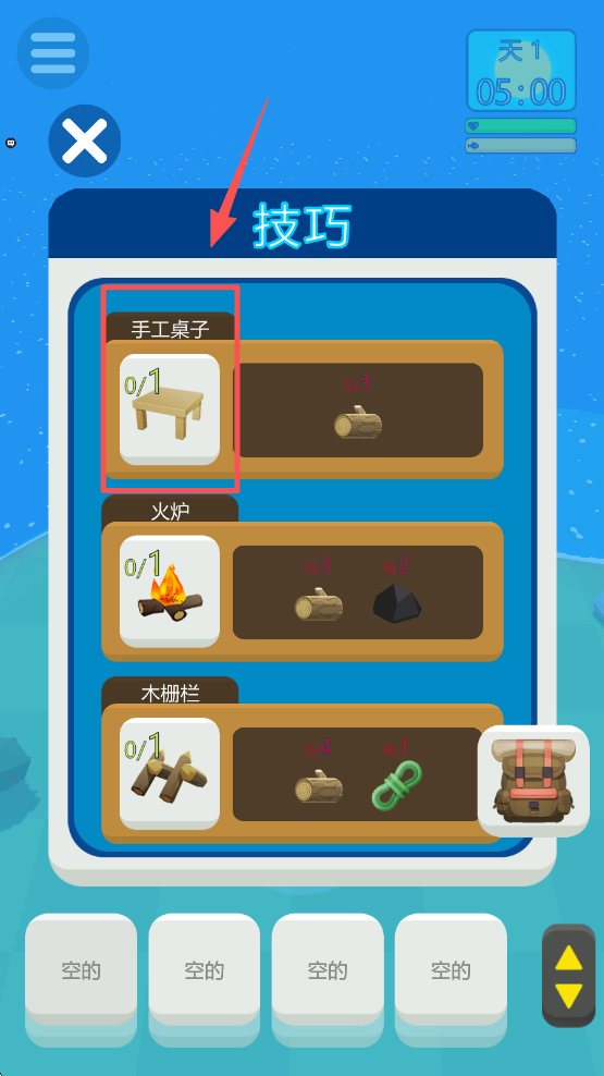 2、查看技巧界面中手工桌子的制作需求,确认所需材料为 3 个树木资源。