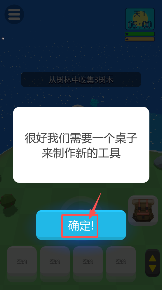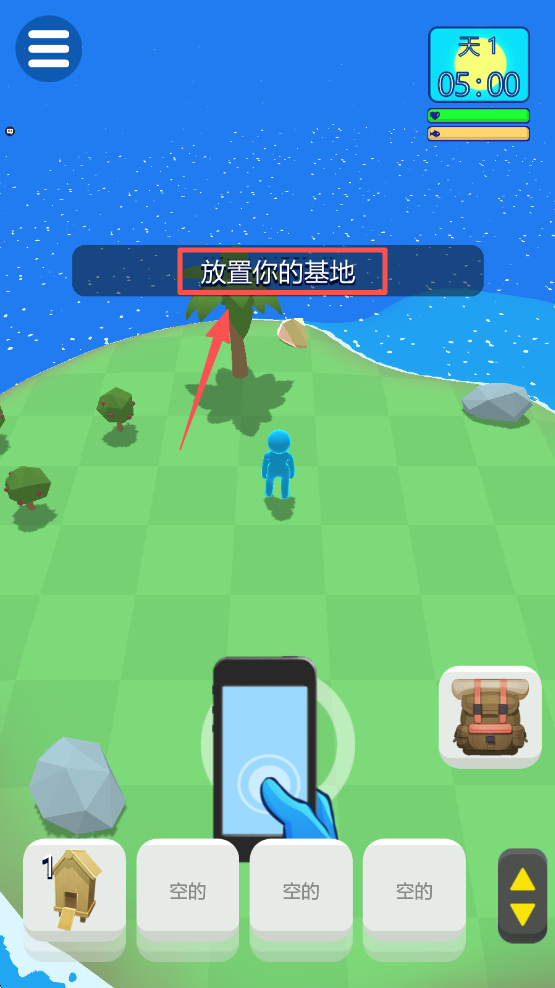 1、在场景中点击提示区域,完成基地的初始放置操作,开启生存流程。