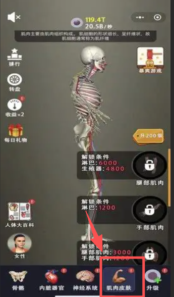 3、在人体系统界面,点击 “肌肉皮肤” 分类,查看该系统的解锁条件与升级选项。
