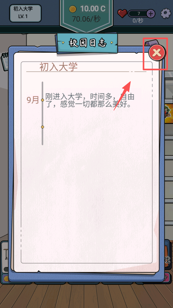 1、查看校园日志,了解游戏剧情和任务。点击右上角的“X”关闭日志窗口。