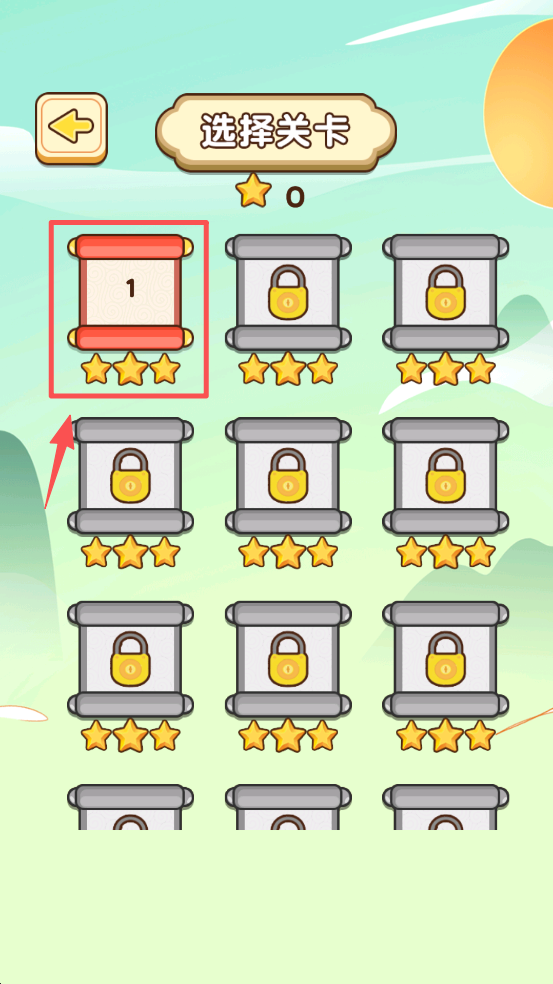 3、然后,在关卡选择界面,点击第一关,解锁并进入游戏。