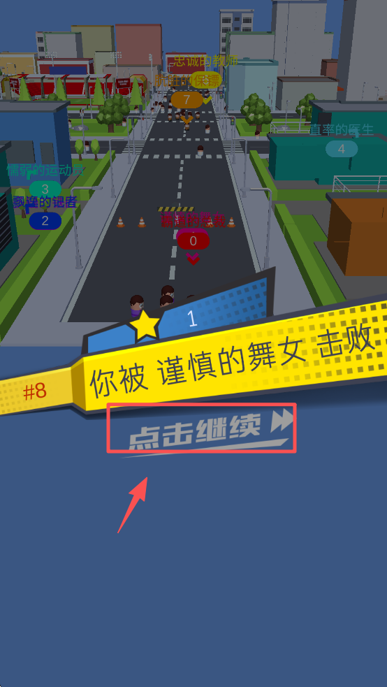 3、当你被击败后,点击“点击继续”按钮,重新开始游戏或选择退出。