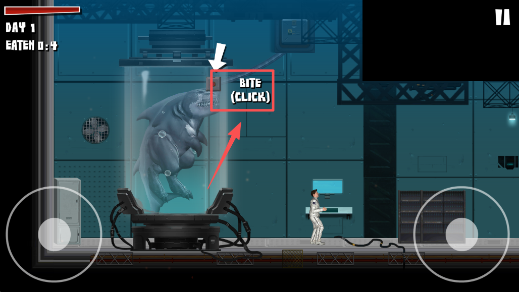 3、进入关卡后,找到 “BITE (CLICK)” 提示区域,点击它来操控鲨鱼恐龙发动咬击。