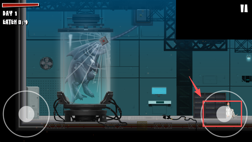 4、完成咬击操作后,通过右侧的移动按钮控制角色移动,靠近目标完成互动。