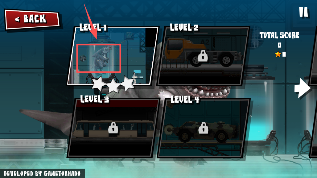 2、在关卡选择界面,点击已解锁的 “LEVEL 1” 关卡图标,进入第一关的游戏场景。